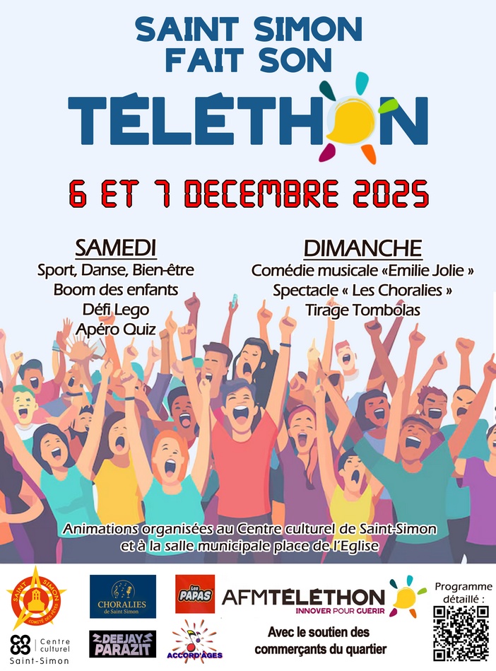 Le Comité des fêtes Toulouse Saint-Simon organise le Téléthon de Saint-Simon du 6 au 7 décembre 2025. Le Téléthon de Saint-Simon est un engagement des habitants du quartier, des associations, des commerçants, du Centre social, du Centre Culturel, des Parents d’élèves des écoles, etc… pour soutenir la recherche sur les maladies génétiques, notamment les myopathies et récolter des dons.